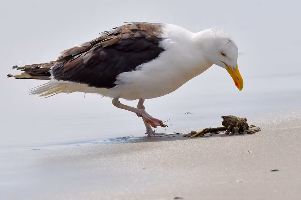 Có lẽ vì quá đói, khi nhìn thấy một con cua nhện xuất hiện, mòng biển hung hăng đã quyết định đây sẽ là bữa trưa của mình. Nó hạ xuống và bắt lấy con cua ngay tức khắc.
