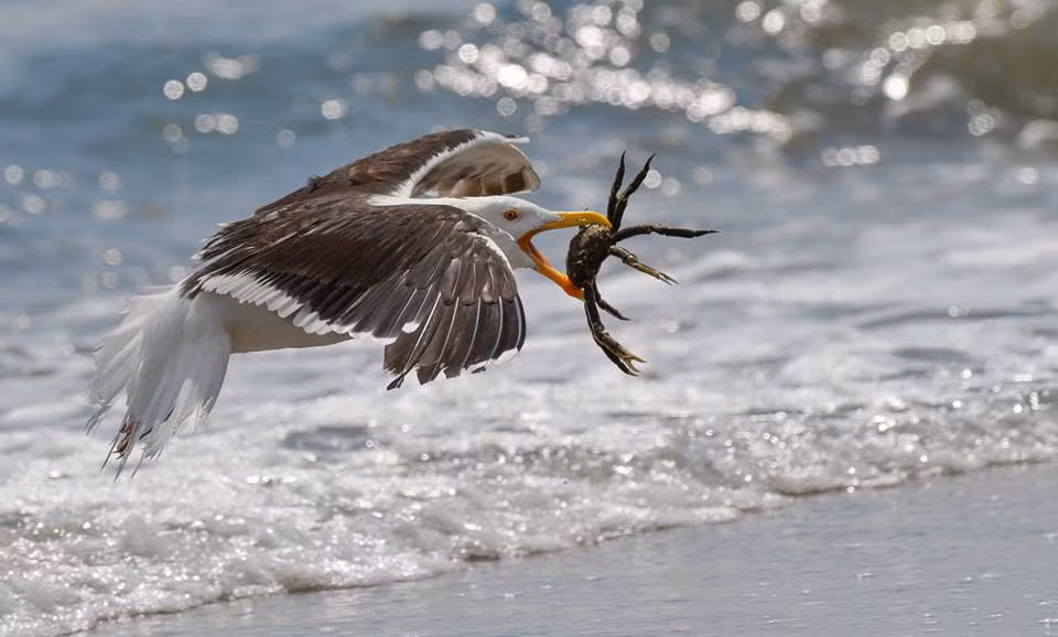 Con mòng biển khá vui vẻ, nó ngậm con cua nhện trong miệng rồi bay tới khu vực vắng vẻ trên bãi biển, chậm rãi thưởng thức bữa trưa khó nhằn nhưng tươi ngon của mình.