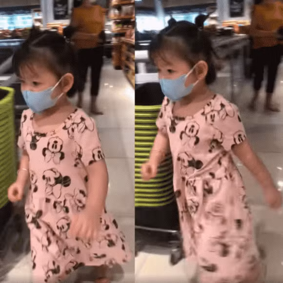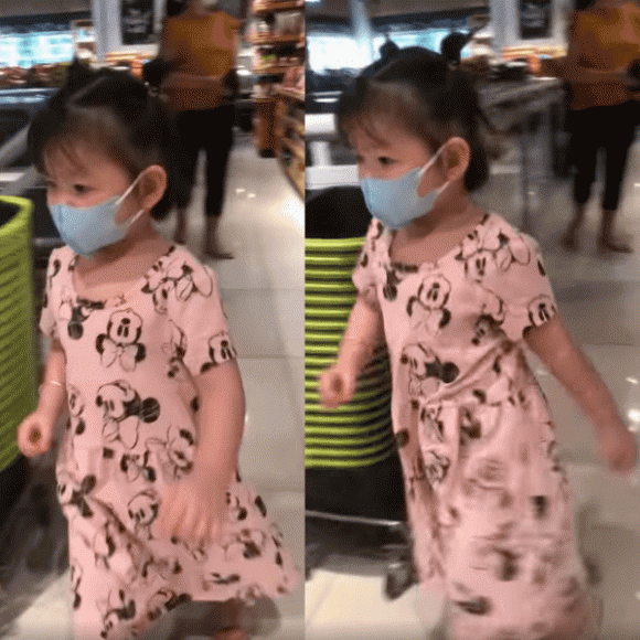 Quách Ngọc Ngoan sợ con gái va vào quầy trưng bày hàng hóa nên lên tiếng nhắc nhở. Tuy nhiên, ái nữ vẫn ung dung vui vẻ tự mình khám phá từng khu vực trong siêu thị. Hành động nhất quyết khiến bố chưa kịp đi theo là công chúa nhỏ đã lấn sân sang khu vực khác trông cực dễ thương.