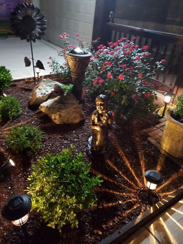 Buổi tối căn nhà lung linh với đèn, hoa rực rỡ.