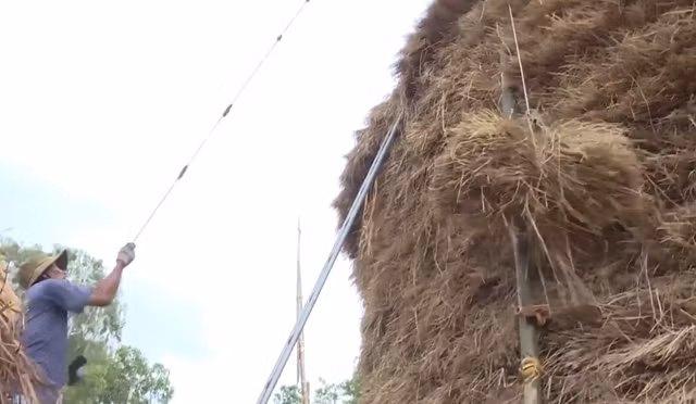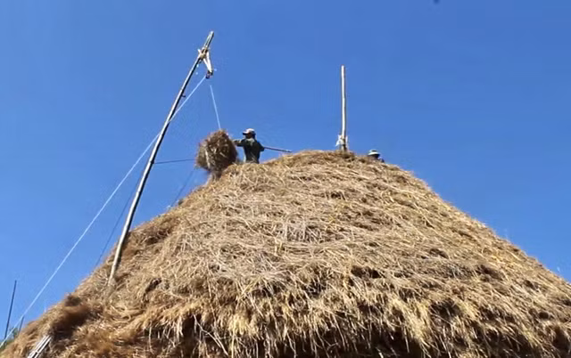 Để chất rơm, cùng với dùng thang cao trèo lên ngọn và ròng rọc kéo đưa lên.