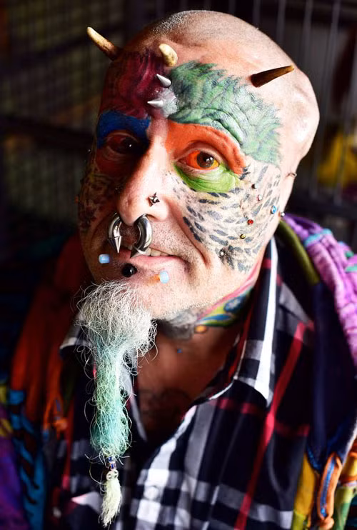 Để được thỏa ước nguyện, "dị nhân" này đã phẫu thuật cắt tai, chẻ lưỡi, vẽ 110 hình xăm và cấy thêm 50 vật thể lên toàn bộ cơ thể để giúp ông có ngoại hình giống vẹt nhất.