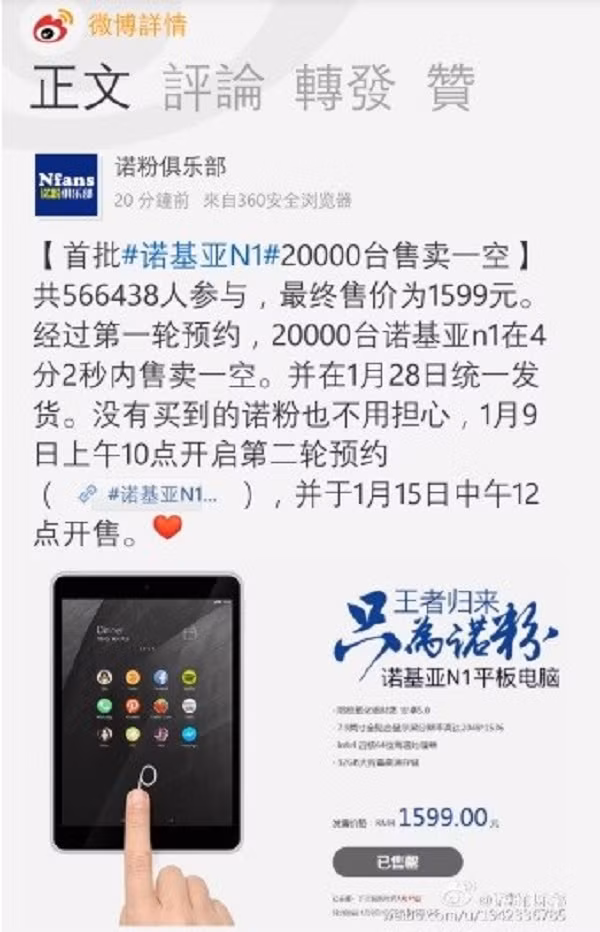 Máy tính bảng Nokia N1 đã được bán tại Trung Quốc ngày hôm nay và hãng chỉ mất bốn phút và hai giây bán ra toàn bộ hàng trong kho.