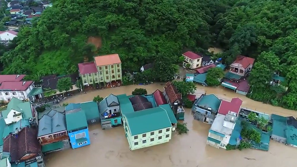 Flycam ghi lại hình ảnh thị trấn Mường Xén (huyện Kỳ Sơn) bị nước lũ bao vây: "Mưa lũ Kỳ Sơn. Đây là hình ảnh thị trấn huyện Kỳ Sơn, cần lắm những tấm lòng hảo tâm" - anh D.K.N bộc bạch trên trang cá nhân
