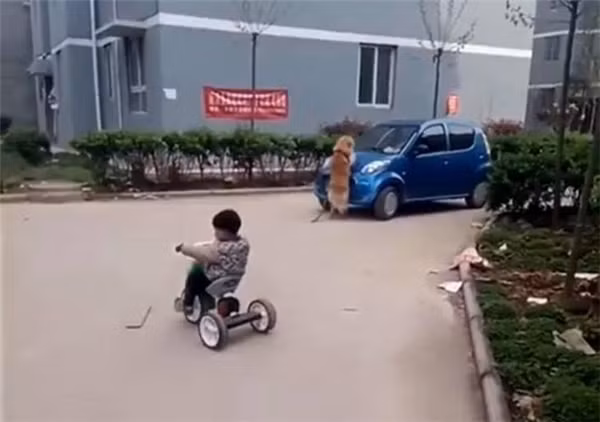 Khi nhìn thấy chiếc ô tô 4 chỗ màu xanh có thể gây nguy hiểm cho cậu chủ đang đạp xe, chú chó dũng cảm đã nhanh chóng chạy đến trước đầu xe để chặn lại. Thật may, vì chiếc xe di chuyển không quá nhanh, nên cả chú chó và cậu chủ của mình đều được an toàn.