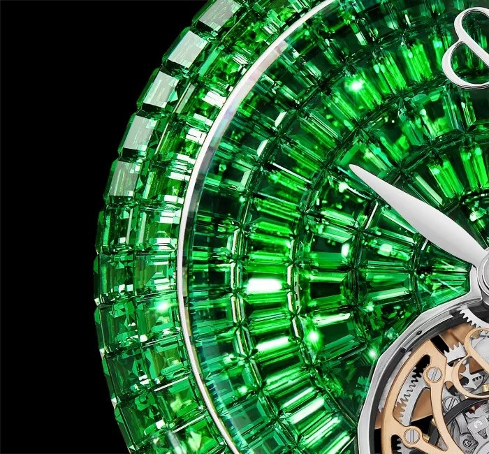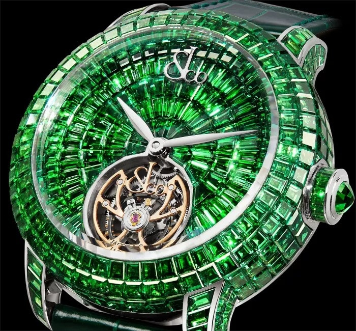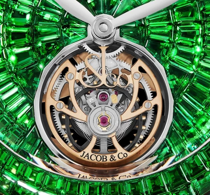 Mẫu đồng hồ được trang bị bộ máy tự động độc quyền JCAA43. Bộ máy này có các cầu nối được thiết kế đặc biệt để phù hợp với việc đính đá quý. Thiết bị có khả năng dự trữ năng lượng trong 42 giờ. Ngoài ra, mặt sau bằng tinh thể sapphire giúp người dùng thấy rõ cấu tạo bên trong. Ảnh: Jacobandco.