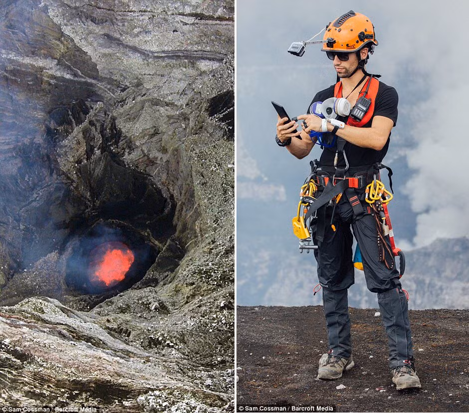 Nhà thám hiểm Sam Cossman đứng ngay trên miệng hồ dung nham nóng bỏng.