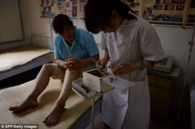 Một bệnh nhân đang được bác sĩ cho ong đốt vào chân tại một phòng khám y học cổ truyền ở ngoại ô Bắc Kinh.