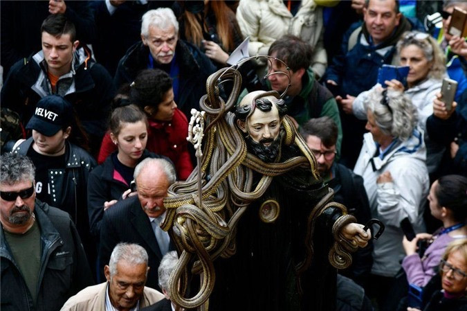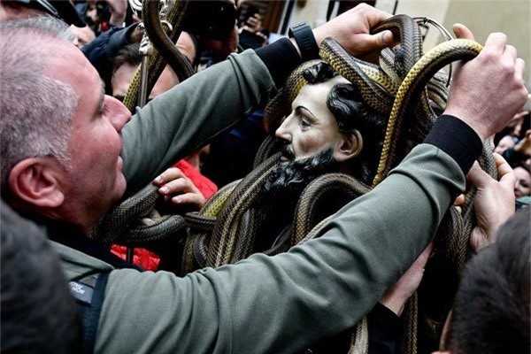 Hàng năm, người dân tại thị trấn Cocullo, Italia sẽ dùng những con rắn còn sống để tô điểm cho một bức tượng gỗ tạc vị thánh bảo trợ của mình, rồi tổ chức lễ rước linh đình qua các đường phố.