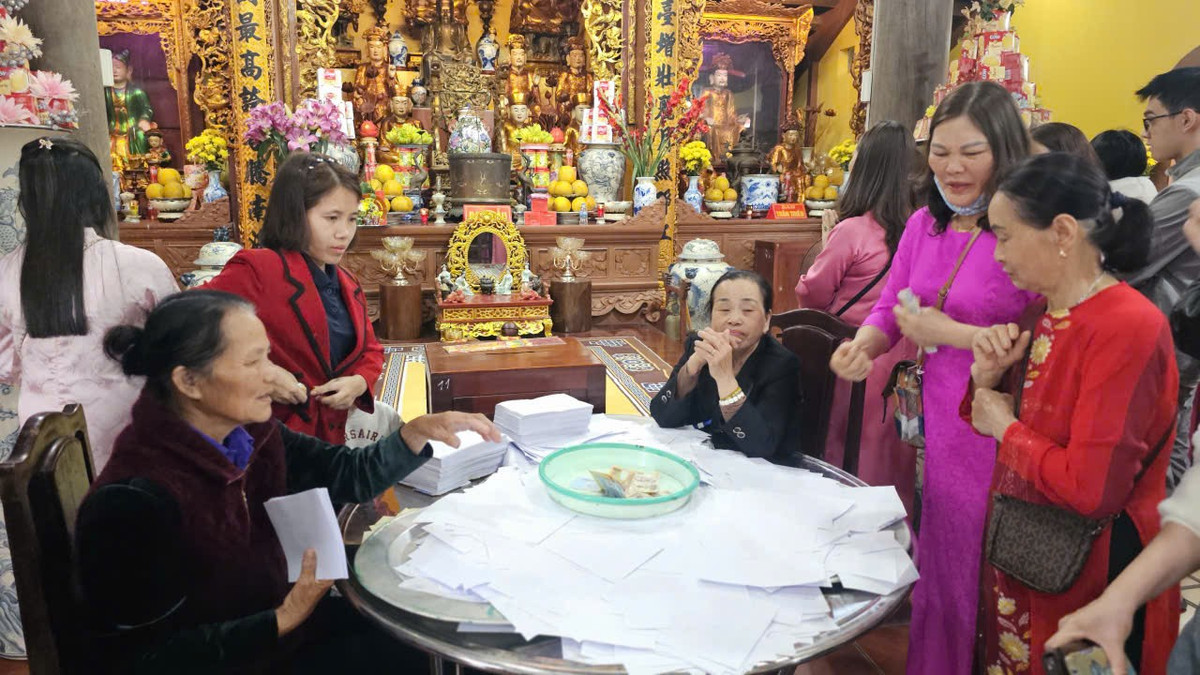 Quẻ thẻ được bày ngay dưới ban thờ, du khách rải tiền lẻ, quệt tiền tượng Phật… là những hình ảnh chưa đẹp đầu xuân tại chùa Tranh thuộc xã Ninh Giang, Hải Phòng.