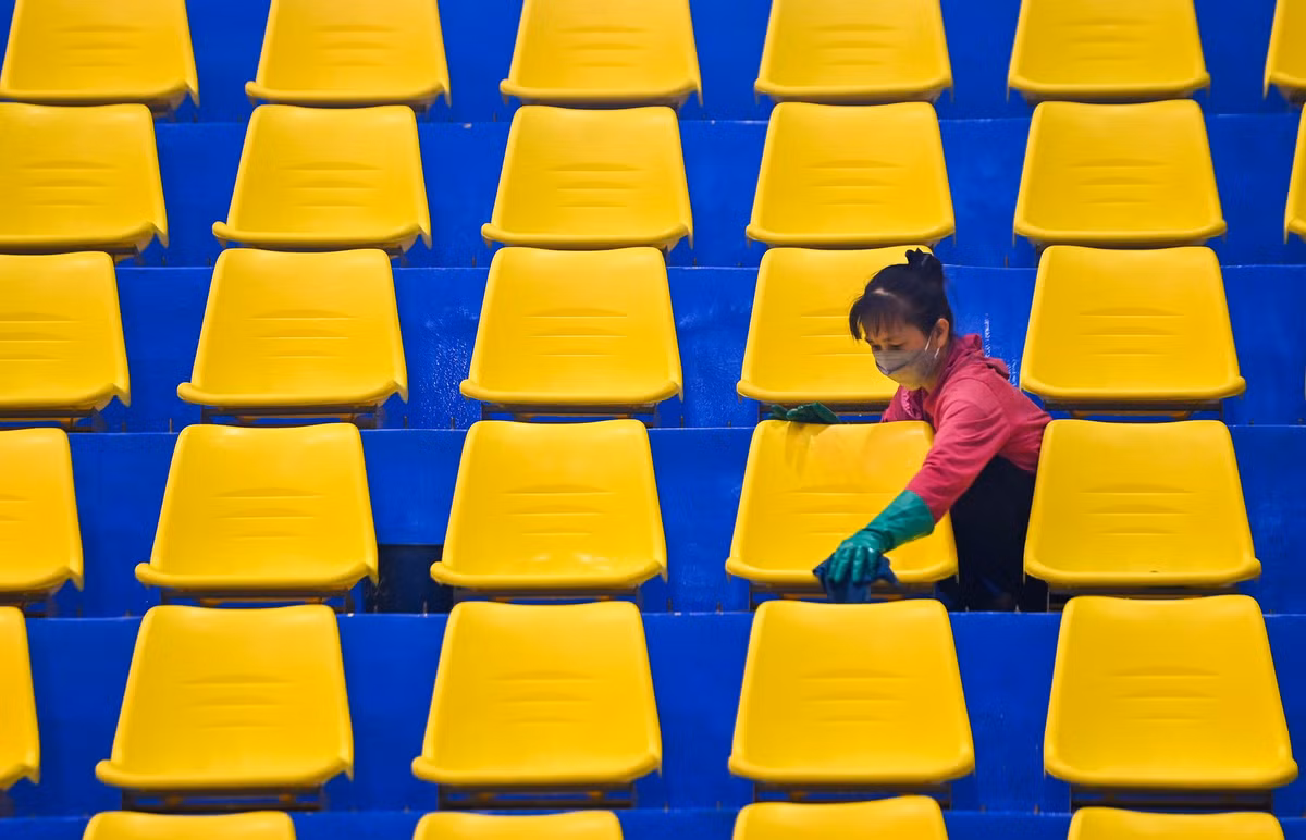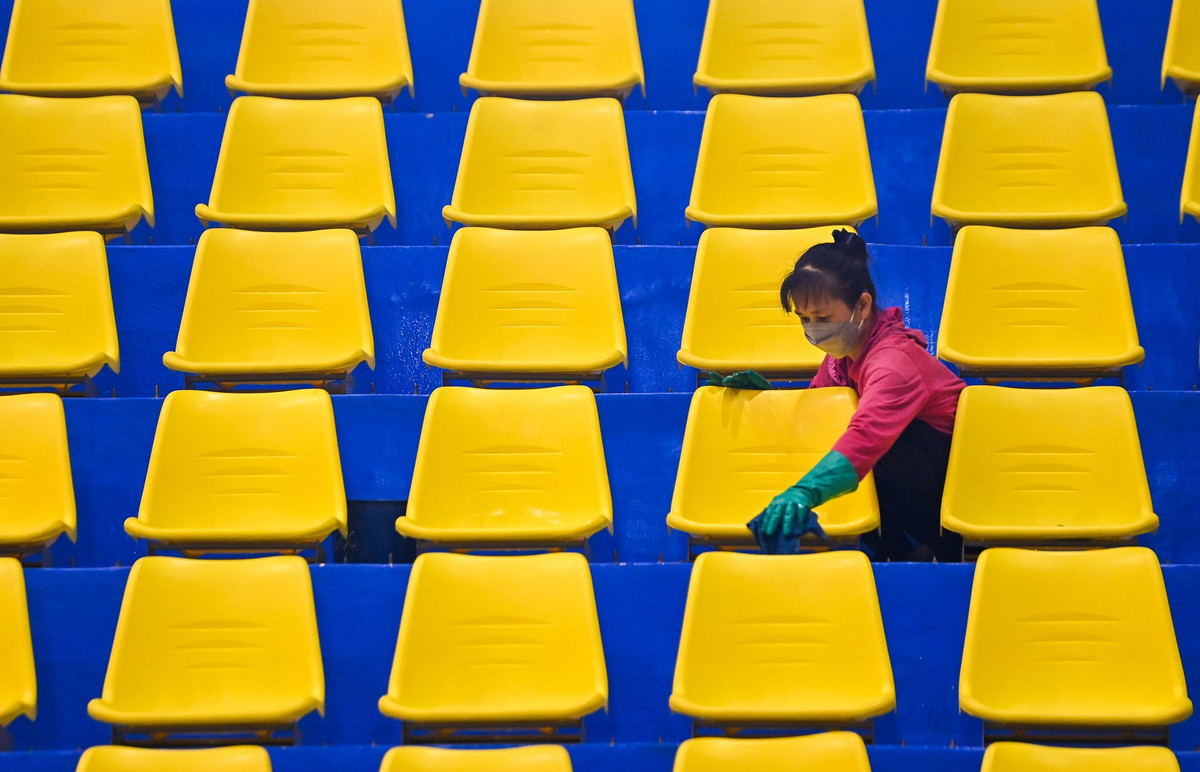 Công nhân đang vệ sinh các khu vực khán đài, sân bên ngoài cung thể thao. Một số hạng mục được nâng cấp, sửa chữa các hạng mục đảm bảo tính thẩm mỹ và an toàn.