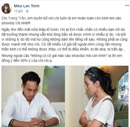 Mới đây, cựu người mẫu Trang Trần và nữ ca sĩ Miko Lan Trinh vừa có một cuộc tranh luận nảy lửa về chuyện trinh tiết. Cụ thể là cựu người mẫu Trang Trần gây sốc khi phát ngôn về các cô gái hoạt động showbiz: "Không ai vào showbiz mà còn trinh".