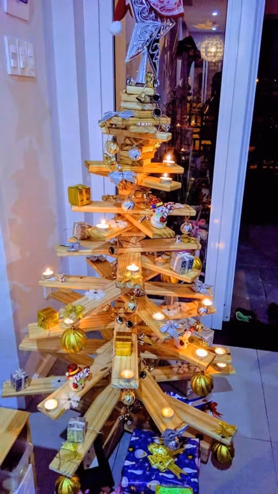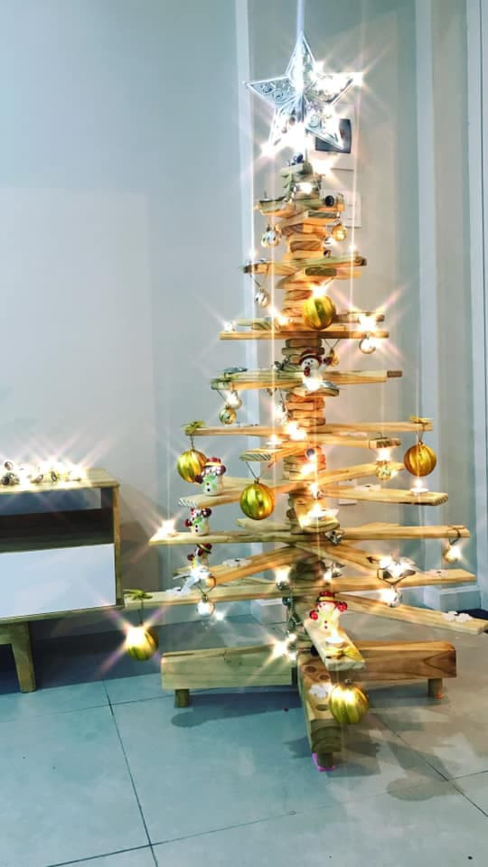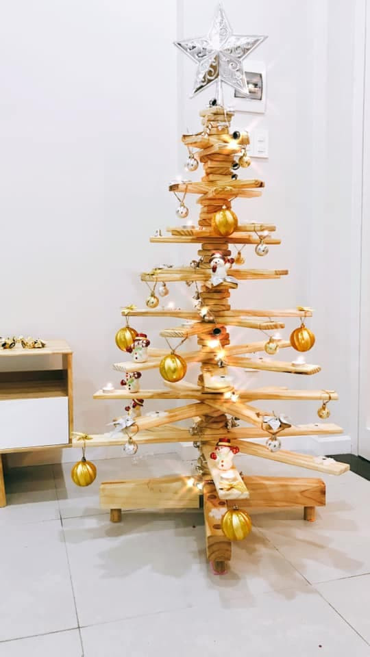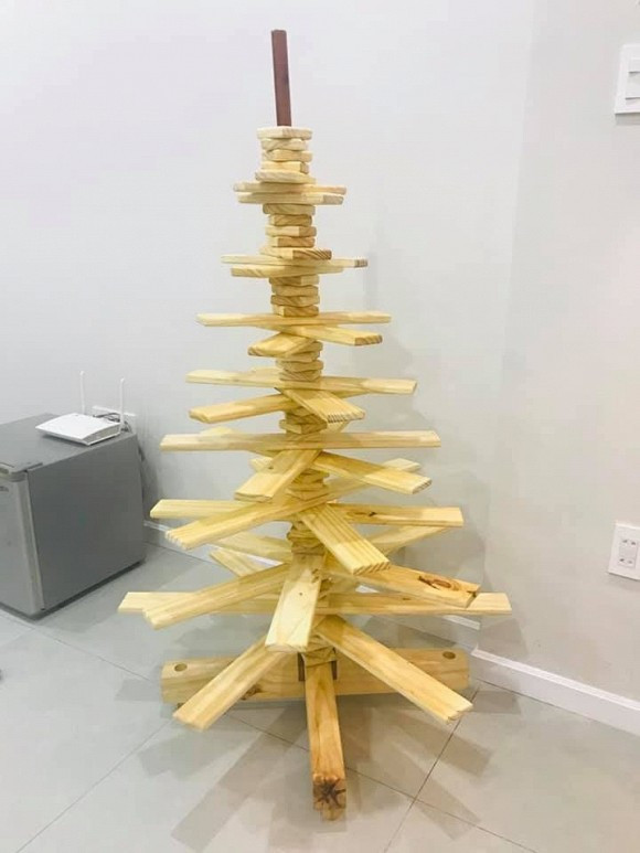 Cây thông lạ mắt được dựng từ những thanh gỗ trong biệt thự triệu đô của Ngọc Trinh.