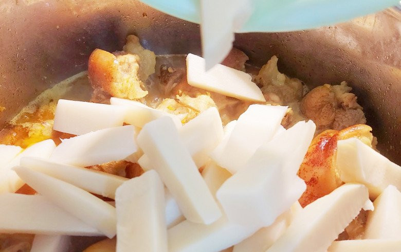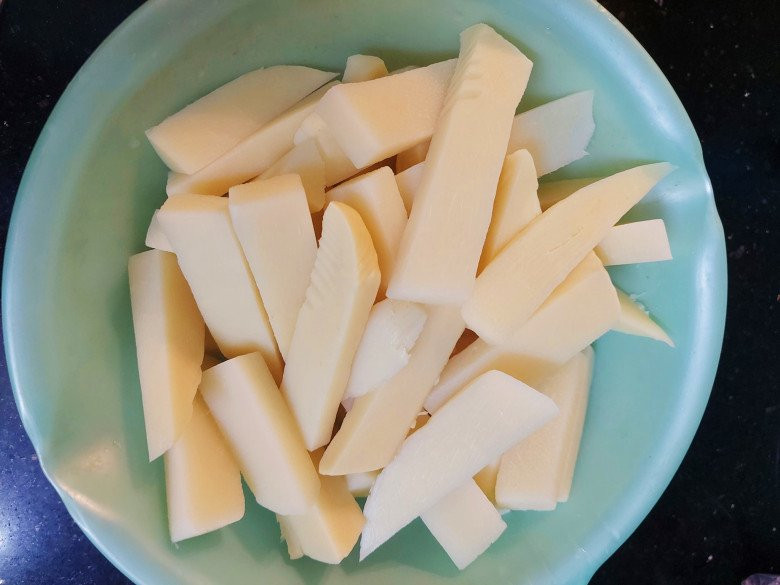 - Măng củ gọt bỏ phần già, bổ miếng to bằng 2 ngón tay để nấu cùng.