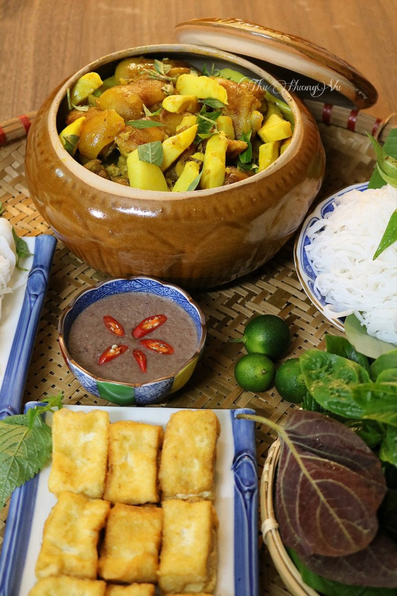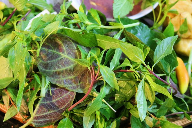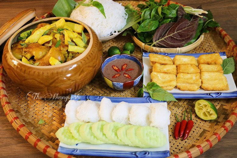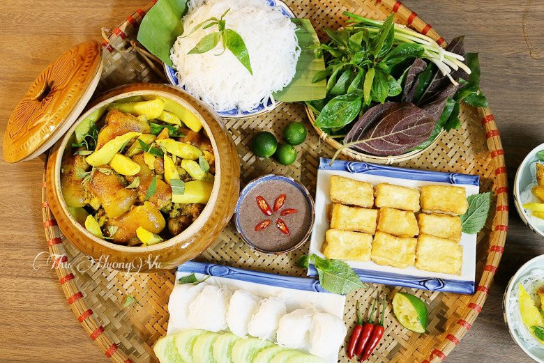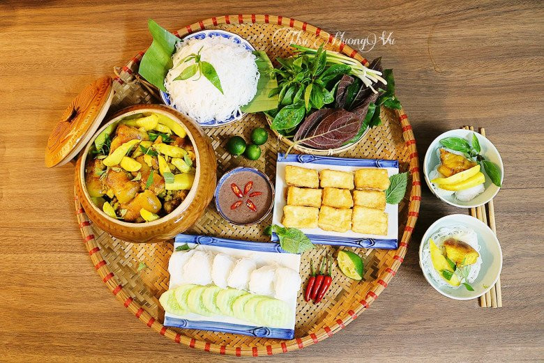 - Rau ăn kèm: Húng chó, mùi tàu, lá mơ, hành, răm, ngổ, kinh giới, dưa chuột...