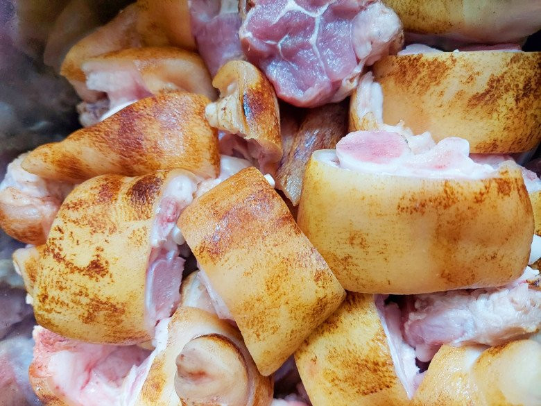 - Thịt chân giò, móng giò thui xong thì cạo phần cháy và rửa sạch. Chặt khúc, thái miếng vừa ăn (thái thịt to hơn kho tàu chút nha, dầy cỡ khoảng 2 ngón tay chập lại).