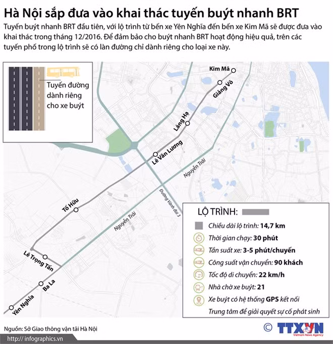 Tuyến buýt nhanh BRT đầu tiên, với lộ trình từ bến xe Yên Nghĩa đến bến xe Kim Mã sẽ được đưa vào khai thác trong tháng 12/2016.