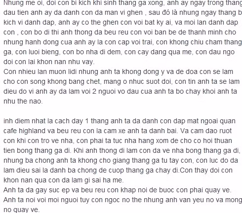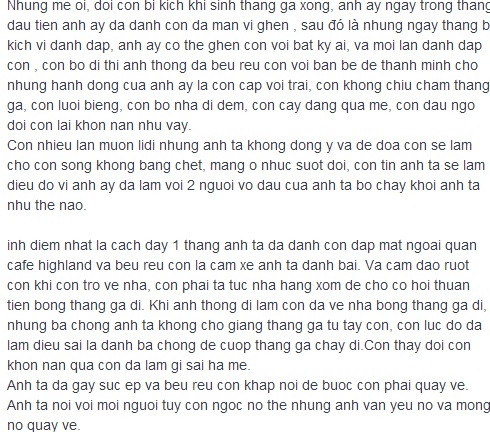 Đỉnh điểm nhất cách đây một tháng, anh ta đã đánh con dập mặt ngoài quán cafe Highland và bêu rếu con là cắm xe anh ta đánh bài. Và cầm dao rượt con khi con trở về nhà. Con phải tá túc nhà hàng xóm để chờ cơ hội thuận tiện bồng thằng Gà đi. Khi anh Thông đi làm con đã về nhà bồng thằng Gà đi nhưng bị ba chồng anh ta không cho, giằng thằng Gà từ tay con. Con lúc đó đã làm điều sai là đánh ba chồng để cướp thằng Gà chạy đi. Con thấy đời con khốn nạn quá. Con đã làm gì sai hả mẹ?