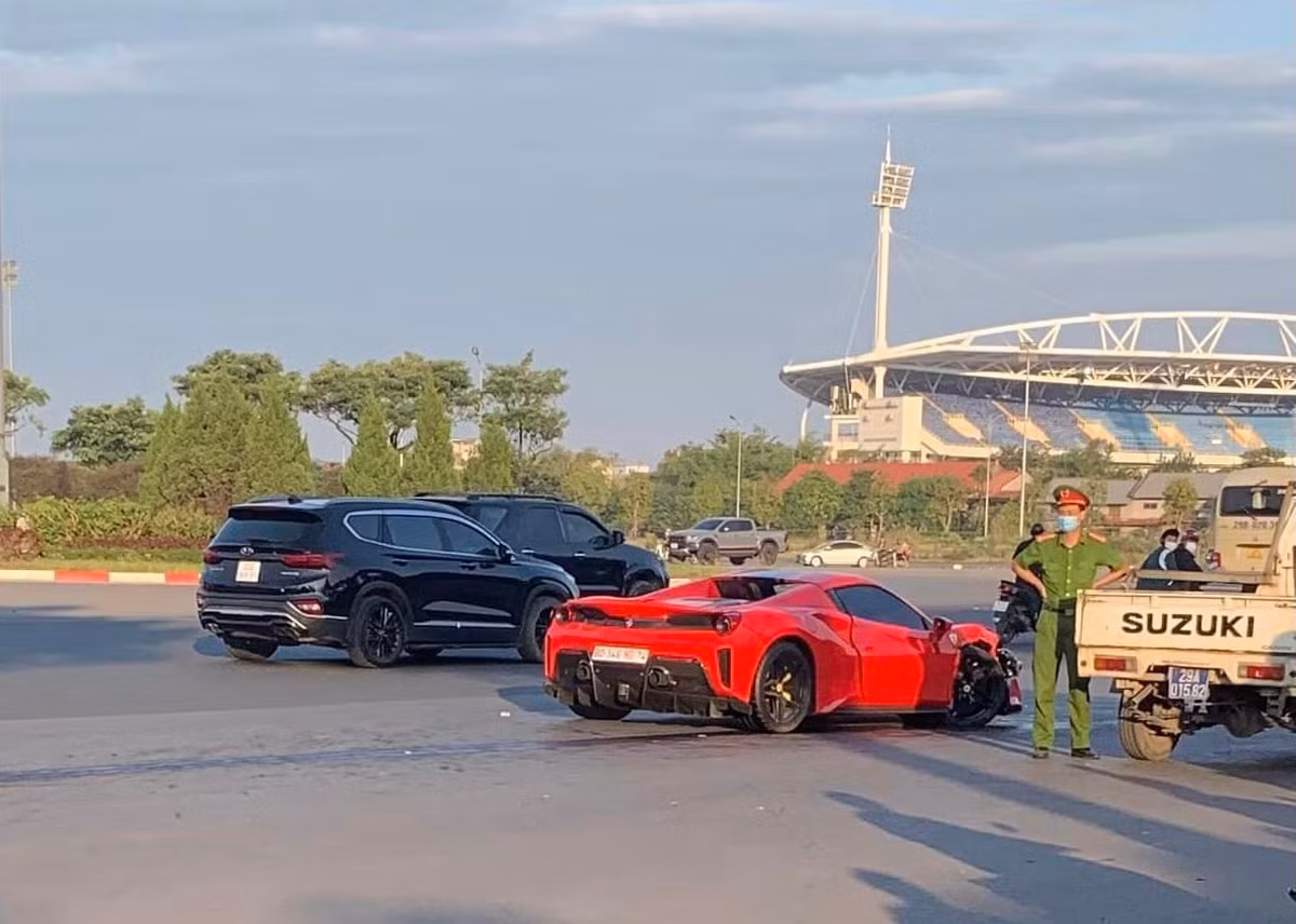 Thời điểm trên, một chiếc siêu xe Ferrari màu đỏ, đang lưu thông theo hướng Lê Quang Đạo - Lê Đức Thọ đã va chạm với một chiếc xe máy BKS: 29T1- 337.xx chạy cùng chiều phía trước.