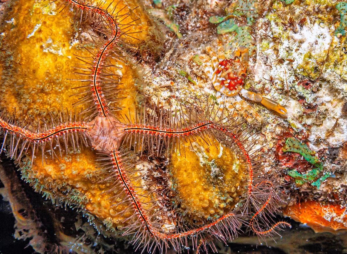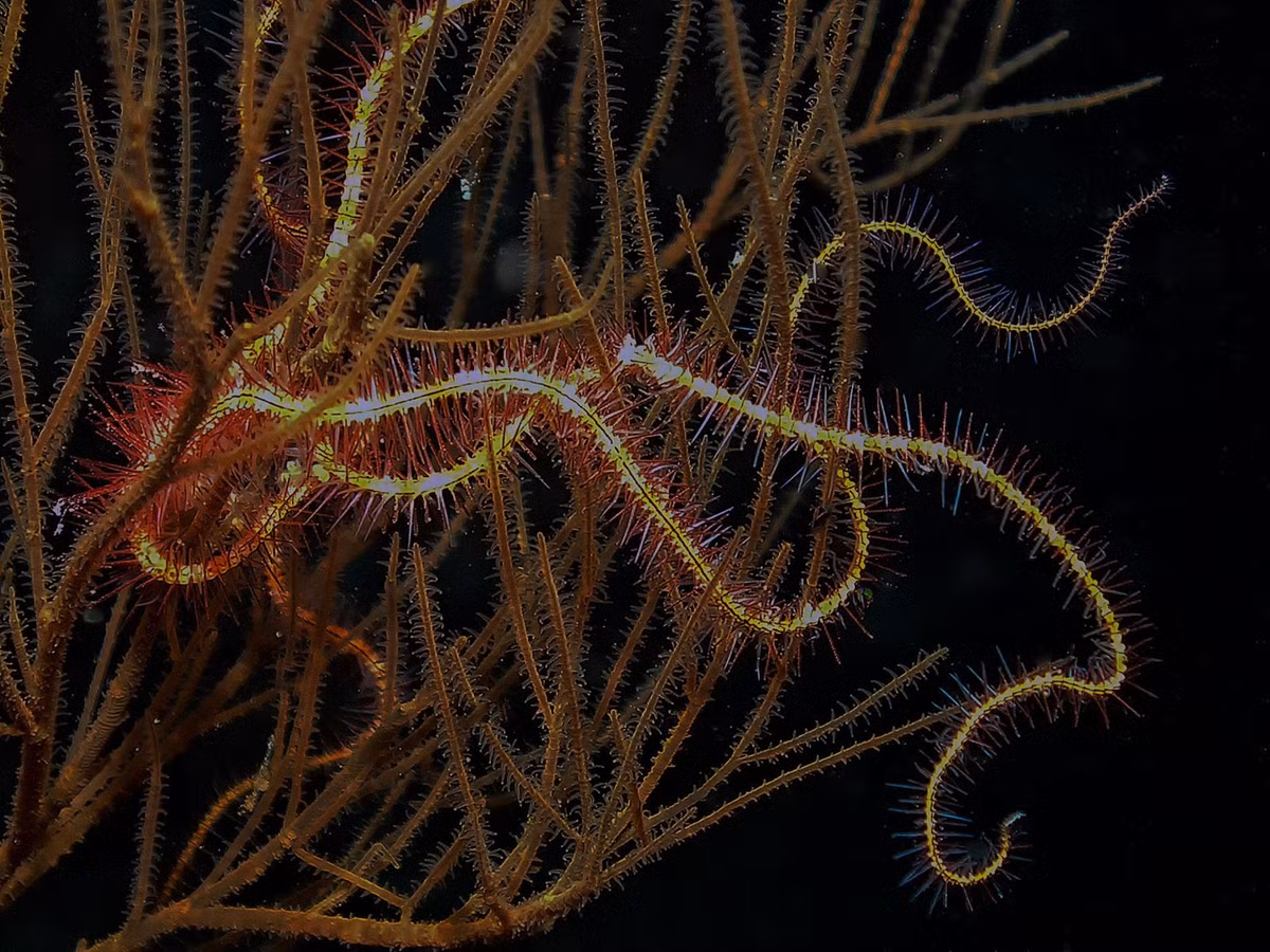 Sao biển đuôi rắn thuộc lớp Ophiuroidea, là họ hàng gần của sao biển nhưng mang dáng vẻ hoàn toàn khác biệt. Thay vì những cánh tay dày và chậm chạp, chúng sở hữu cánh tay dài, mảnh và linh hoạt như những con rắn nhỏ, có thể uốn lượn theo mọi hướng. Phần đĩa trung tâm của cơ thể tách biệt rõ rệt với các cánh tay, tạo nên hình dáng giống một “bộ khung sống” vừa thanh mảnh vừa bí ẩn.
