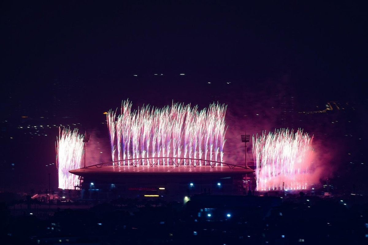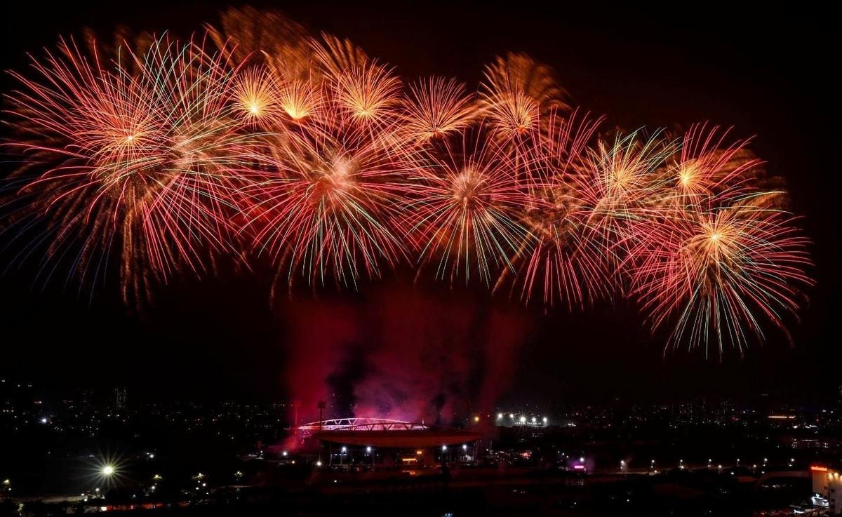 Khu vực sân vận động quốc gia Mỹ Đình lung linh với màn pháo hoa tầm cao trong đêm sơ duyệt chương trình nghệ thuật đặc biệt “Dưới lá cờ vẻ vang của Đảng”.