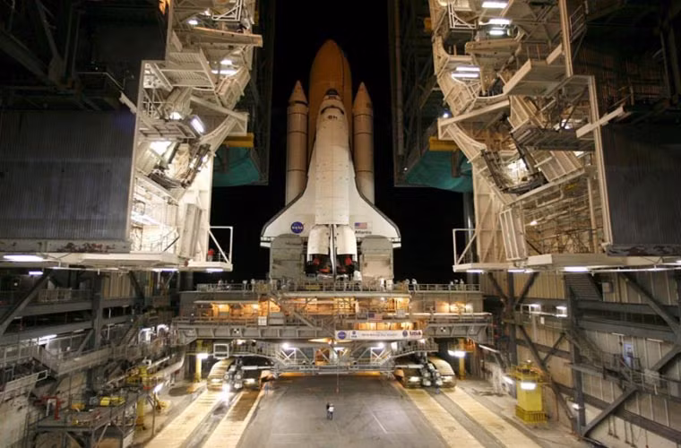 Nhân viên NASA đang đứng trên bệ phóng di động dưới tàu Atlantis.