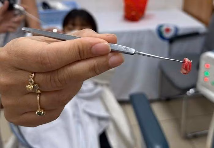 Ngay khi phát hiện dị vật, các bác sĩ Khoa Tai Mũi Họng đã tiến hành gây tê và nội soi lấy dị vật, thủ thuật được thực hiện nhanh chóng, an toàn và chính xác.