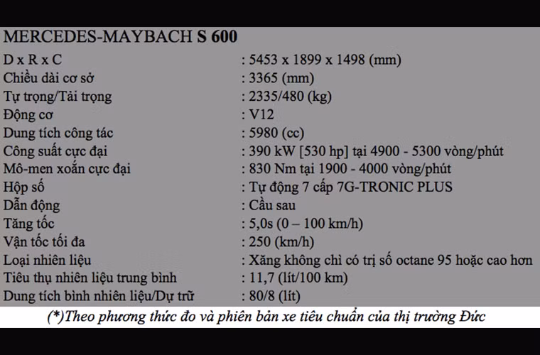 Mercedes-Maybach S600 sử dụng động cơ V12 twin-turbo 6.0L cho công suất 530 mã lực tại vòng tua 4.900-5.300 vòng/phút, mô-men xoắn 830 Nm tại 1.900 – 4.000 vòng/phút. Xe có khả năng tăng tốc từ 0 – 100 km/h chỉ mất 5,0 giây và đạt vận tốc tối đa 250 km/h, có mức tiêu thụ nhiên liệu vào khoảng 11,7L/100km với dung tích bình xăng là 80,8L.