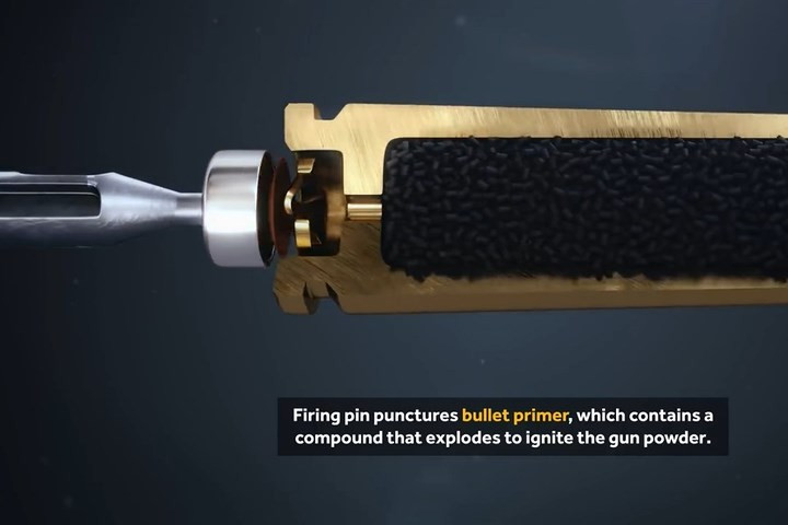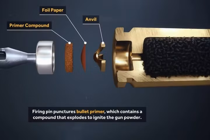 Lực từ búa truyền sang kim hỏa và kim hỏa chọc vào đuôi viên đạn.