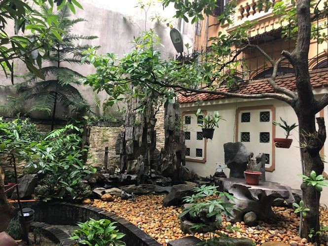 Trong khi tầng 1 của ngôi nhà được vợ chồng nam ca sĩ thiết kế làm bếp, kết hợp với nơi để xe. Không gian mở phía sau là khu vườn với nhiều loại cây hoa và một ao cá nhỏ.