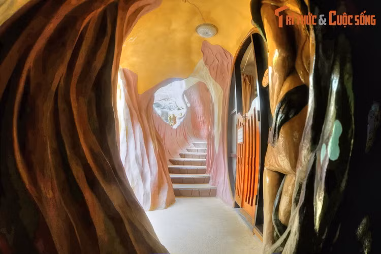 Phía trong mỗi tòa nhà có những hành lang uốn lượn như hang động, cầu thang quanh co, các căn phòng cách bài trí nội thất kỳ quặc...
