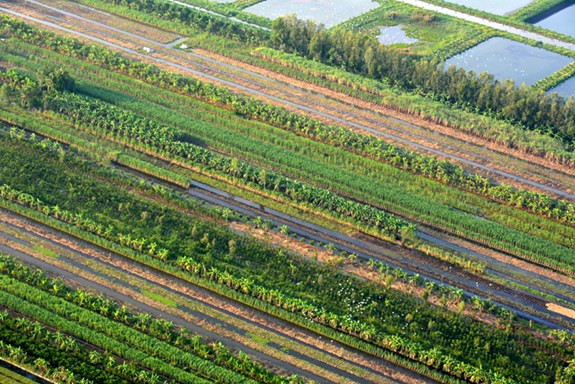 Từ trên cao, những vườn dừa, vườn chuối, ruộng mía… hiện ra như những tấm thảm khổng lồ với màu xanh bát ngát.