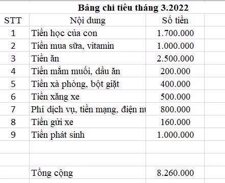 Các khoản chi tiêu này bao gồm: Tiền học của con, tiền ăn hàng ngày, xăng xe, tiền dịch vụ, đồ dùng trong nhà,... 10 triệu đồng còn lại, chị dành tiết kiệm, chuẩn bị cho các mục tiêu lớn trong tương lai.