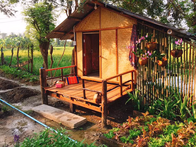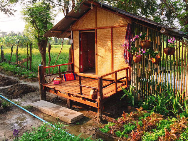 Khu nhà được người chủ dựng lên từ mảnh đất cũ do ông bà để lại, nhằm giúp mọi người trải nghiệm cuộc sống làng quê, trồng rau nuôi gà,... như một người nông dân thực thụ.