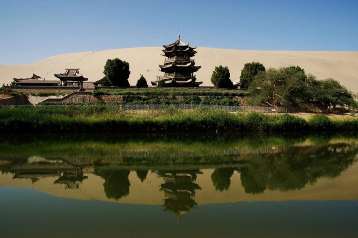 Yueyaquan là một hồ nước hình lưỡi liềm trong một ốc đảo giữa sa mạc Gobi.