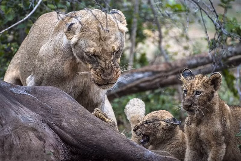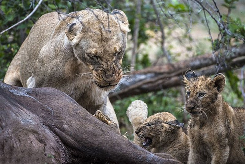 Sư tử mẹ "nổi đóa" đánh con nhỏ vì bị giành ăn
