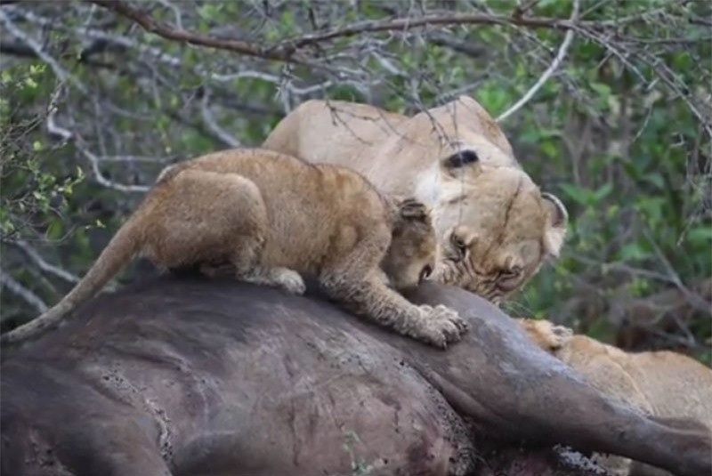 Theo tiết lộ của Wessels, sư tử mẹ vừa săn được con trâu rừng khá lớn. Tuy nhiên, nó lại nổi giận với sư tử đực con vì thói ham của con mình.