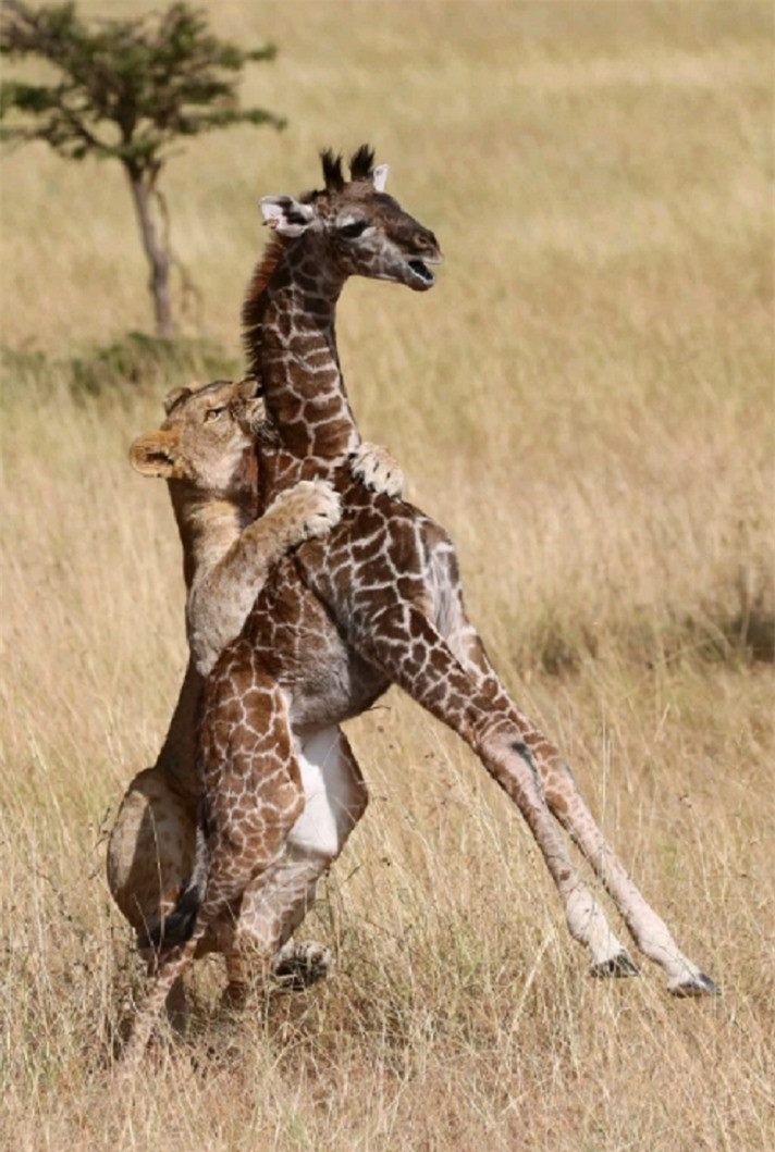 Con hươu cao cổ mẹ cố gắng đặt con non ở dưới bắp chân để che chắn khỏi những cú vồ nhanh và hiểm ác của lũ sư tử.