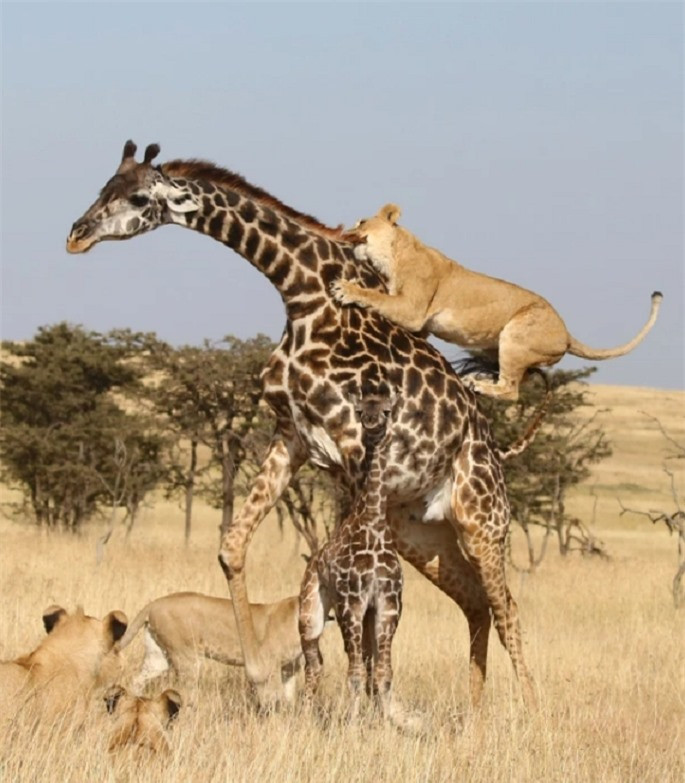 Nhưng điều đó cũng không thể chống lại sức mạnh của đàn sư tử 4 con đang chờ làm thịt mẹ con hươu cao cổ.