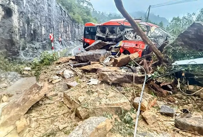 Đá từ trên núi đổ xuống, đè nát xe khách. Ảnh báo Pháp luật TPHCM