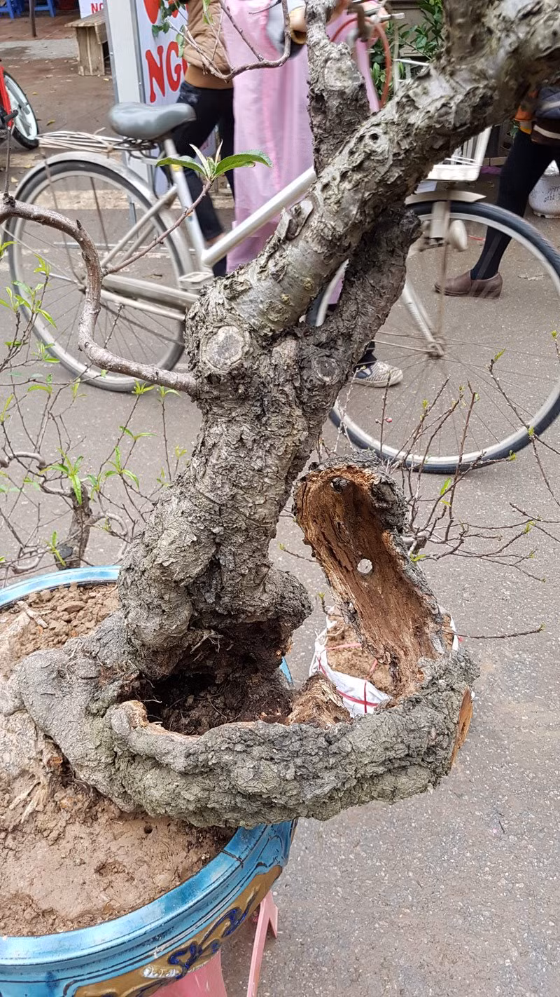 Cây đào độc đáo có tuổi đời hàng chục năm, có nguyên một bên thân đang lũa, chỉ còn lại phần vỏ nhưng vẫn bám chắc chắn ở phần gốc chính.