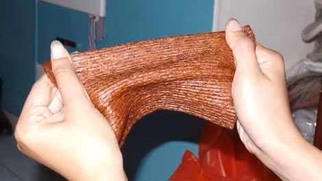 | Sản phẩm có độ dàn hồi, dai, bị biến dạng khi dùng tay kéo mạnh. Ảnh: N.Đan. |