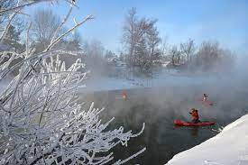 Một thành viên của câu lạc bộ bơi mùa đông 'Kriofil' ('Cryophile') khi bơi ở sông Yenisei dưới nhiệt độ -30 độ C. Ảnh: Sputnik.
