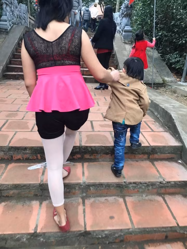 Mới đây, cộng đồng mạng liên tục truyền tay nhau chia sẻ những hình ảnh bị cho là phản cảm về gu ăn mặc của một bà mẹ bỉm sữa dẫn con đi lễ chùa ngày đầu năm. Cụ thể, bà mẹ này diện một bộ trang phục kết hợp không giống ai như: chân váy hồng ngắn cũn cỡn kết hợp với quần đùi, quần tất và áo ren lộ nội y.