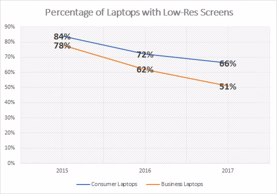 Dù có khoảng 2/3 số laptop thông thường vẫn sở hữu các màn hình thuộc loại "bỏ đi", nhưng con số này đã giảm từ 72% năm 2016 và 84% năm 2015. Năm 2015, 78% các hệ thống máy dùng cho doanh nghiệp có màn hình độ phân giải thấp, tức là đã giảm đến 27% chỉ trong vòng 2 năm.