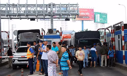 | Các tài xế phản ứng tại BOT T2 vào chiều nay. |