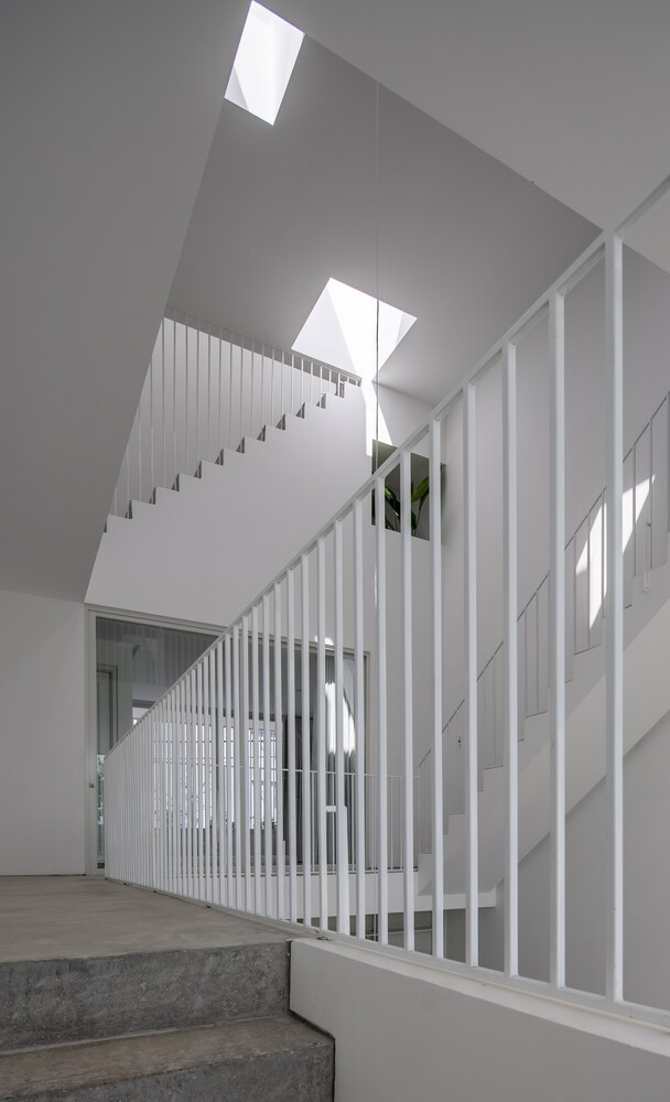 Cầu thang được thiết kế như một sàn catwalk bắt đầu từ tầng trệt ở cầu thang trong phòng khách, sau đó đi lên và bao quanh giếng trời ở mỗi tầng đến tầng trên cùng, nơi ánh sáng ban ngày chiếu qua năm “hộp nhiệt đới”