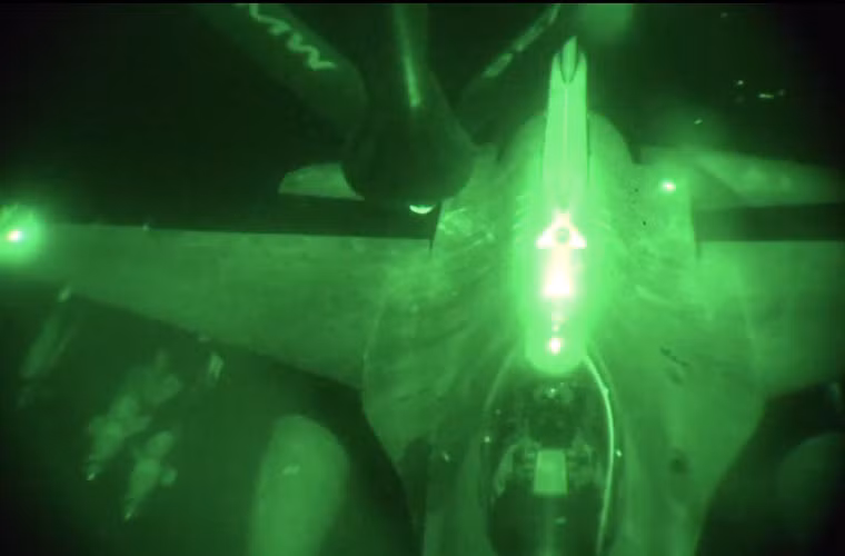 Trong ảnh, hệ thống tiếp dầu trên máy bay KC-135 đang chuyển nhiên liệu vào bộ phận tiếp nhận đặt trên lưng máy bay F-22A.
