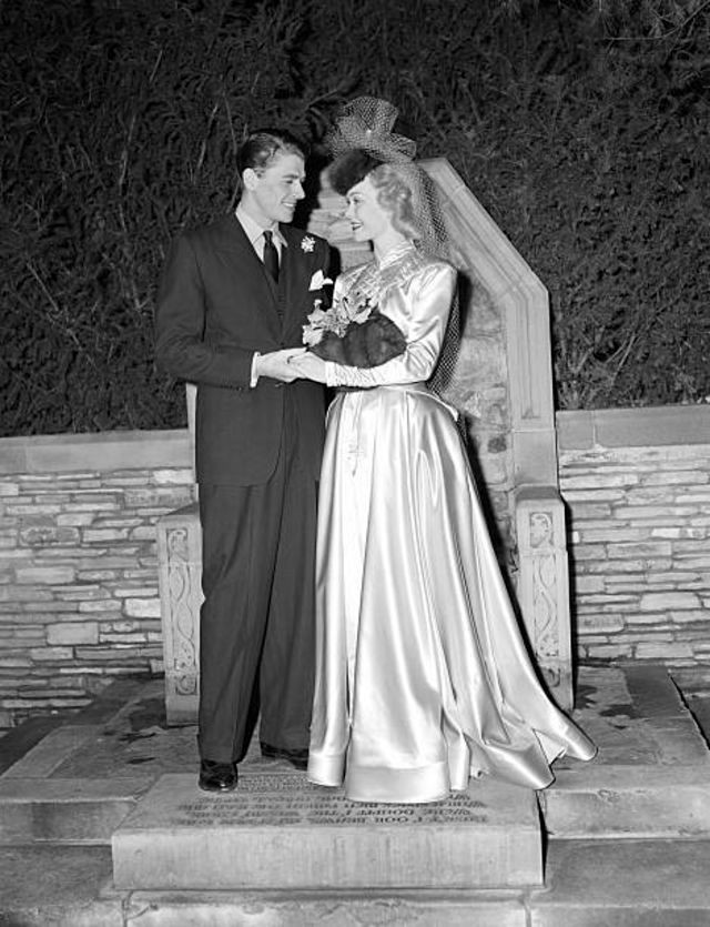 Ông Reagan và vợ cầm tay nhau bên bánh cưới. Hai người đã đóng cùng nhau trong bộ phim Brother Rat (1838) và sau đó là phần tiếp theo của nó, Brother Rat and a Baby (1940).