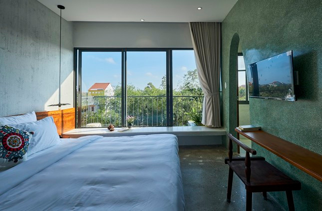 Chọn một khu vườn khô kiểu Nhật với đá mộc được sắp đặt có chủ ý dọc theo cầu thang đá mài xanh ngọc - kiểu cầu thang quen thuộc trong kiến trúc nhà phố cũ. Dẫn lối lên các tầng phía trên là các phòng lưu trú có đầy đủ tiện nghi khép kín.